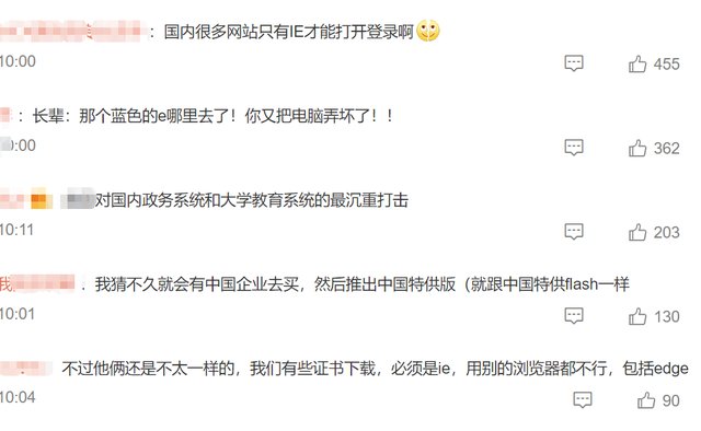 微博表示:“终于,被黑了这么多年,IE希望正式告别。根据资料的显示,1995年,作为Windows 95的默认浏览器,IE浏览器诞生,与《滚石》的《Start Me Up》一起,它从没有出现,迅速占据了市场,三年后,它成为世界上第一个在市场上的浏览器。2003年,IE浏览器进入黄金时代,占市场占有率的95%。