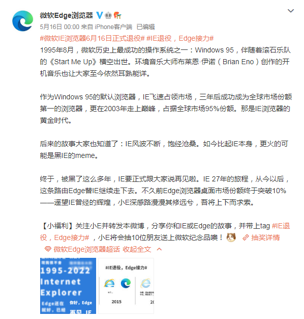 今天,#微软IE浏览器于6月15日被永久关闭,#新闻被热量搜索。 在此之前,5月16日,微软的Edge浏览器在其官方博客网站上宣布,微软的IE浏览器将于6月16日正式退役,其功能将与Edge浏览器相连。