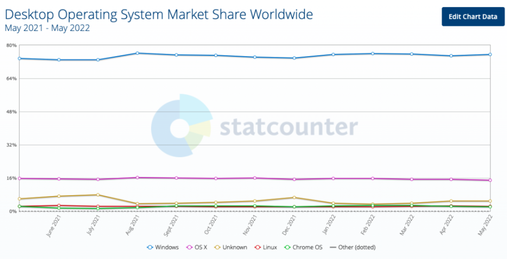 事实上,Windows在全球桌面操作系统市场排名第75位,占市场市场份额的54%。