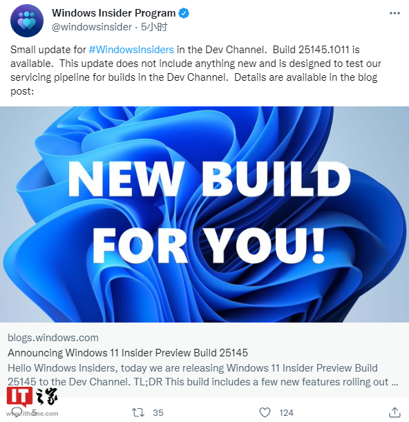 「我们正开始推出Build 25145.1011(KB5016159)的累积更新,此更新不包含任何旨在测试我们在Dev和Beta频道中构建的服务管道的新内容。