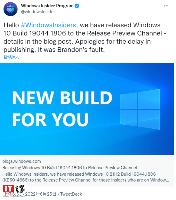 - 2022-06-25 Win10 Build 19044.1806 Release预览版发布
