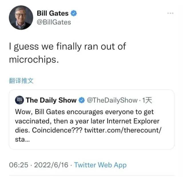 比尔·盖茨(Bill Gates)在Twitter上评论说,因“微芯片被消耗”而关闭了IE浏览器。