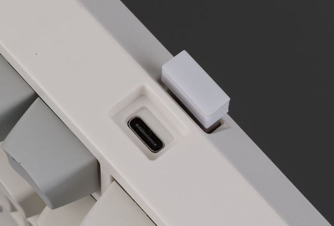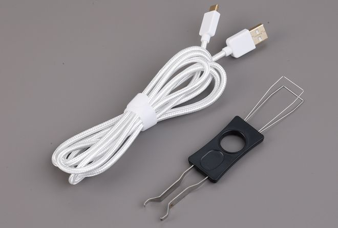 键盘的包装提供了一个编织的USB连接器和一个按钮拉动器。