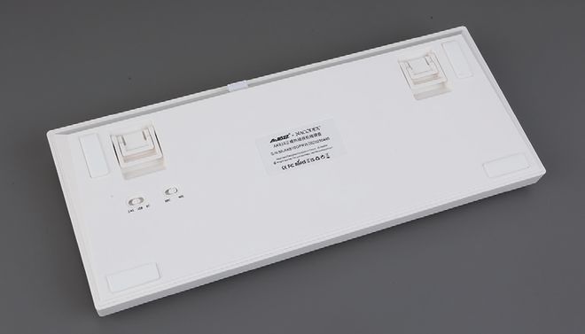 当我们打开键盘时,我们发现机械键盘的底部设计非常干净、简单,没有暴露的螺钉孔。除了两段支撑脚、脚垫和标记的设计外,标记的左边还设计了平台模式和连接模式开关键。
