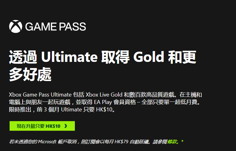4.使用九张XBOX黄金会员季卡,你会发现你的XBOX黄金会员将在三年后届满,然后选择一个月成为XGPU会员,将剩余的黄金会员时间转换为XGPU会员,最长的转换时间可以达到36个月,如果你是一个新用户,有新帐户,一次升级费用为港币10元,如果你是一个老用户,有老帐户,一次升级费用为港币79元;