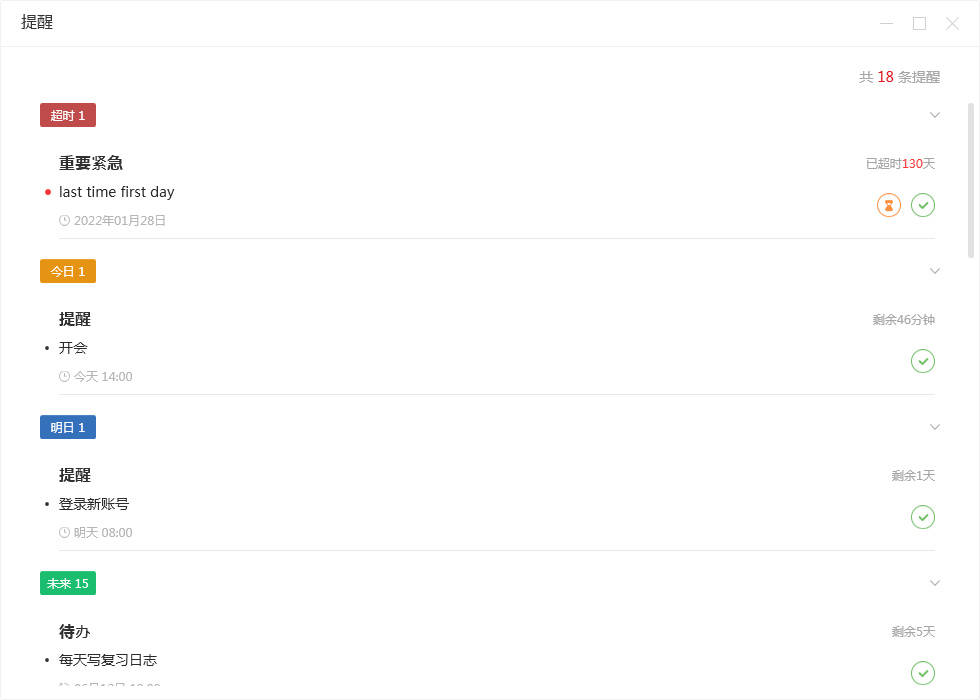 将一个或多个时间减少的项目添加到云标志中,在主接口底部找到提醒按钮,然后点击,可打开提醒列表,检查每个提醒的日数或剩余时间;提醒到期时,再计算的时间也会自动变成加班时间,如需要,可以完成或延迟标记的操作。