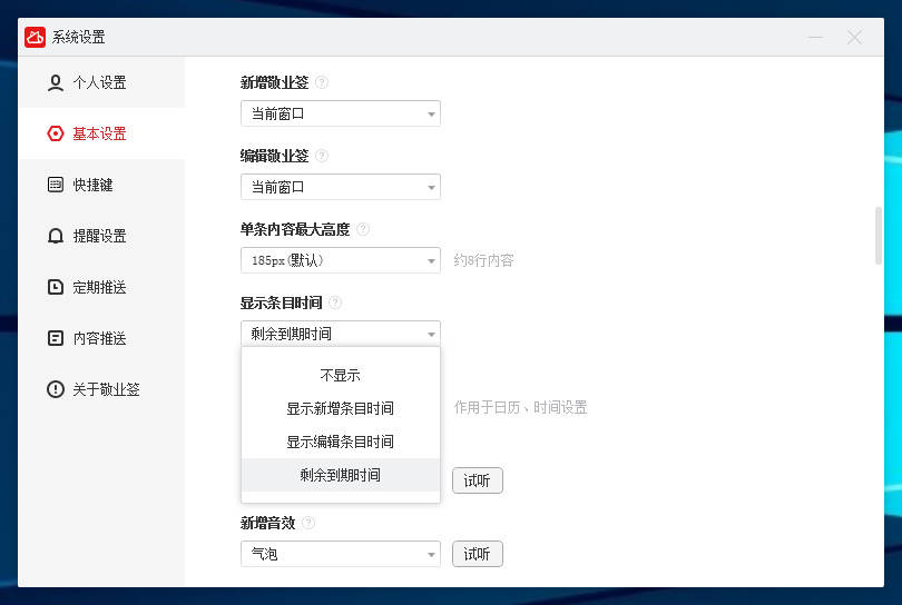 此外,每个提醒的逆时段也可以通过主接口内容列表查看:单击主接口左上角显示的默认标题,或者在右上角找到设置,打开系统设置页面,在基本设置中找到“显示条目时间”,设置为“剩余期限”,您可以回到内容列表,查看每个提醒的计数。
