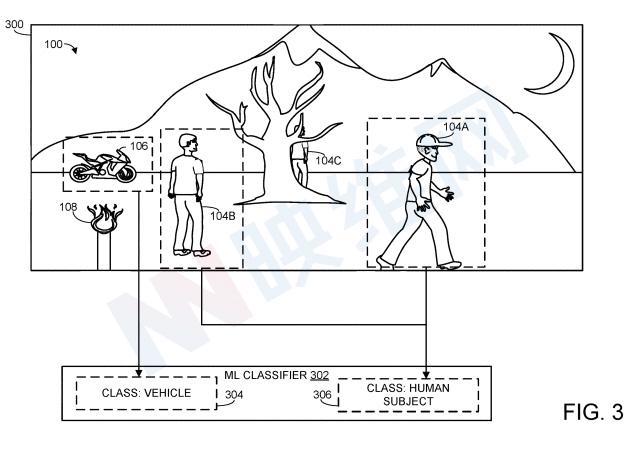 图3说明了感兴趣的对象的识别。如图所示,应用机器学习训练分类器302对输入图像300,将输入图像的输入图像像素分类为与感兴趣对象相符的输入兴趣像素集合。具体而言,分类输入兴趣像素是描绘人类主体104A的像素(这个例子中感兴趣的对象),而306类兴趣对象的标识包括人类。