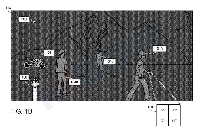 例如在图1B中,热源108具有最高的相对温度,所以使用最轻的阴影。因此,热源108可能比人类104A-104C和车辆106更容易被使用者看到。然而,为用户102,人类和车辆的可视性比热源的可视性更为重要。尤其是在军事或安全应用中。