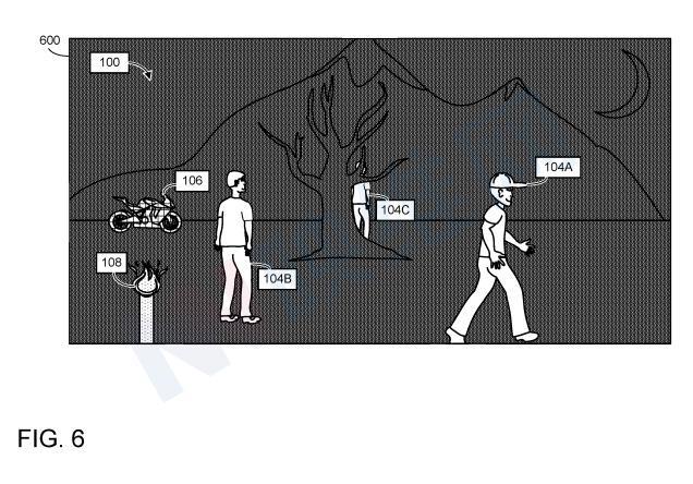 换言之,计算系统可以在第一组感兴趣的像素(例如人对象104A)的阈值相似度中确定第二组感兴趣的像素(例如人对象104C)的相对温度值与第二组感兴趣的像素相符。然后,感兴趣的像素可以适当地为新确定的显示颜色.例如在图6中,正如人们所描绘的104A和104B一样,人类对象104C显示的兴趣像素可以被彩色为白色.