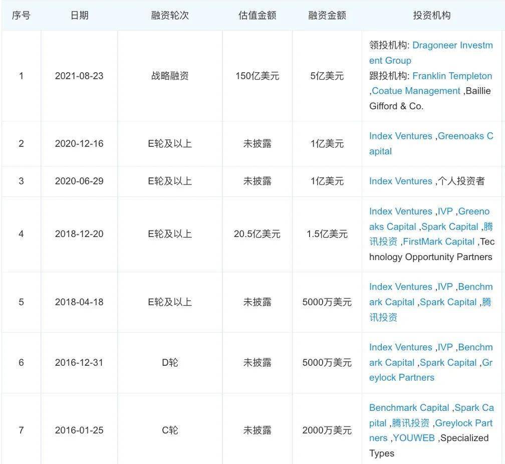 根据 Cruchbase 的数据显示,自2015年 Discord 成立以来,其融资总额接近100亿美元,最近的估价为150亿美元,投资者名单包括一些大型机构,包括 Tencent 和 Benchmark 。