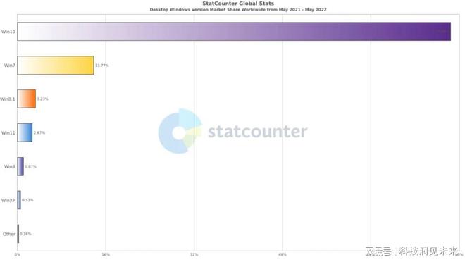 至于去年推出的Windows 11,实际使用率只有2.67%的人口使用Windows 10,占78%。