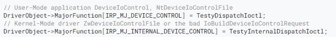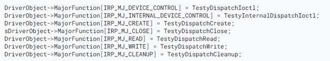 唯一重要的方法是TestyDispatchIoctl,由于我们不能以任意参数调用IoBuildDeviceIoControlRequest或IoAllocateIrp,这是触发IRP_MJ_INTERNAL_DEVICE_CONTROL主函数的函数。如果是,这是因为内部调度方法很少经过适当的测试。