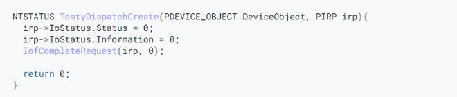 在我们深入研究最有趣的目标之前,IRP_MJ_DEVICE_CONTROL,我们将从IRP_MJ_CREATE开始。每个内核模式驱动程序必须在驱动程序的回调函数中处理IRP_MJ_CREATE。驱动程序必须执行IRP_MJ_CREATE,因为没有它,无法打开设备或文件对象的手柄。