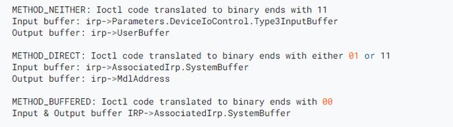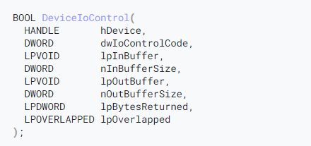 该方法的主要问题是输入/输出缓冲器、它们的长度和Ioctl代码本身。我们从Ioctl代码开始,它是作为注释的32位数;它描述了缓冲区和长度如何使用/再生成到内核,需要 DesiredAccess(当你打开设备手柄时)和功能指示器。示例如下: