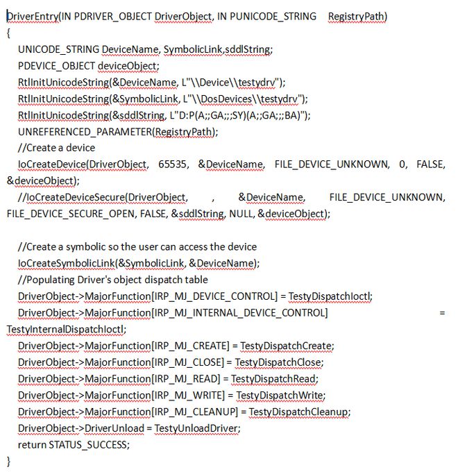 不幸的是,IoCreateDevice方法不允许程序员指定任何ACL,这是不好的。因此,开发者必须在注册表或驱动程序inini文件中定义ACL。如果他们不能做到,任何用户都可以访问该设备。然而,使用IoCreateDeviceSecure方法可以缓解这种情况。