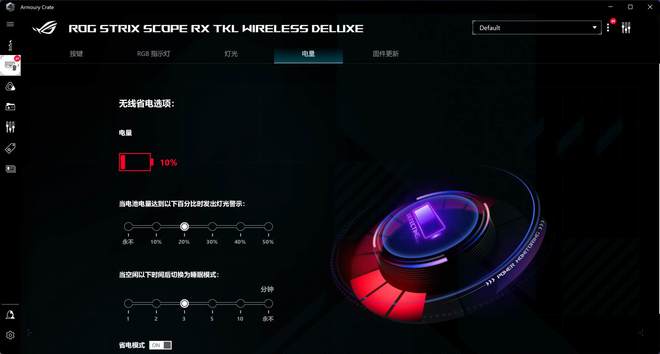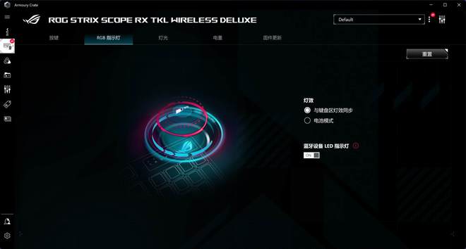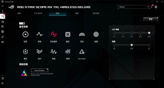 打开电源,看看灯光的效果.默认是运行光模式!亮度可调,但冰豹和闪电蛇没有过分夸大到盲目的程度。在这方面, ROG 游侠 RX TKL 还有一些局限性.但对我来说,它只是轻微的。只要在黑暗的环境中看到角色就足够了。再说了,购买无线键盘当然要使用无线模式!此时闪烁键盘提出了供电持续的供电要求,所以,各花入各眼吧。