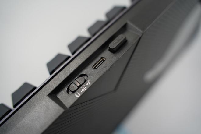 键盘的后部有一个三模式开关,USB-C充电数据接口,以及纳米适配器的位置。