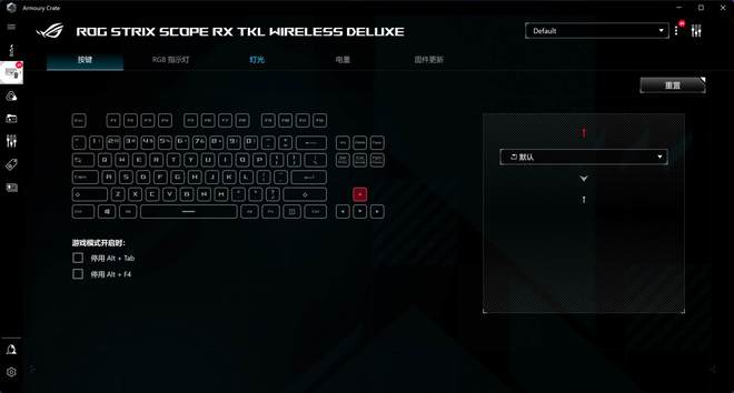 驱动方面,ROG游侠RXTKL使用了著名的"创造",键盘接入电脑后,奥林匹克委员会立即提醒您,每个外部驱动器在OCR平台上被集成安装。键盘设置总共5页,第一页允许您为每个按钮定制功能,您还可以选择在激活游戏模式时,所禁用的组合键。