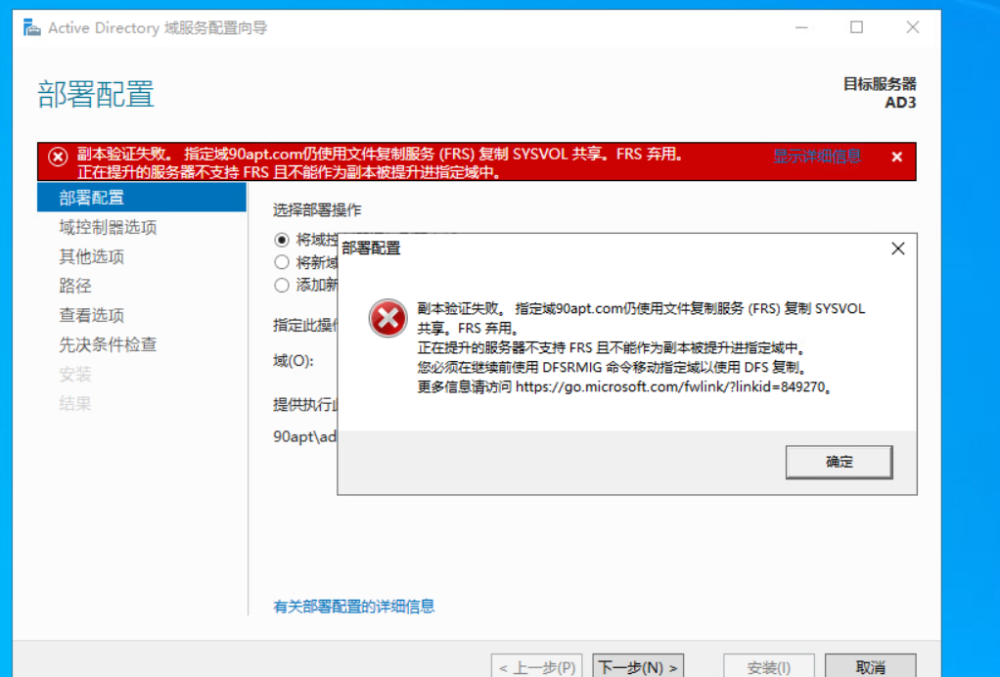 复制验证失败。 指定域仍使用File Replication Service(FRS)复制Sysvol共享。