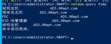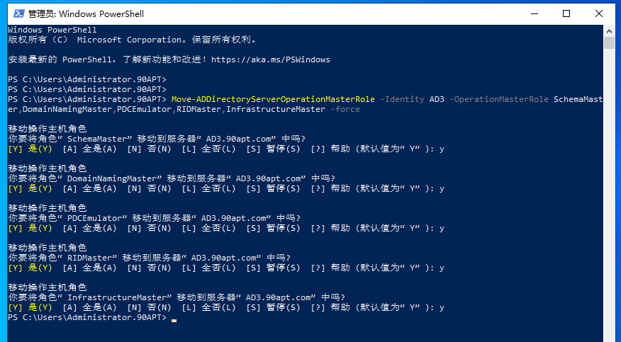 Move-ADDirectoryServerOperationMasterRole -Identity AD3 -OperationMasterRole SchemaMaster,DomainNamingMaster,PDCEmulator,RIDMaster,InfrastructureMaster -force
