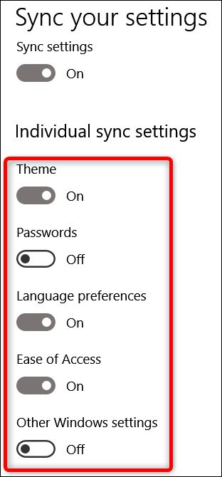 下面是将设置同步到您的Microsoft帐户的列表: