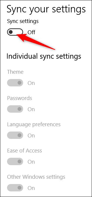 否则,要完全禁用同步设置,请将主要的“同步设置”切换为“关闭”。