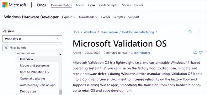 “Microsoft Validation OS是一种轻量、快速、可定制的基于Windows11的操作系统,你可以在工厂车库里使用,诊断、减轻和修理Windows设备制造过程中的硬件缺陷。确认操作系统可以启动到命令行环境中,提高工厂车间的可靠性,并支持运行Win32应用程序,使从早期的硬件到零售操作系统和应用程序开发的过渡更加顺利。