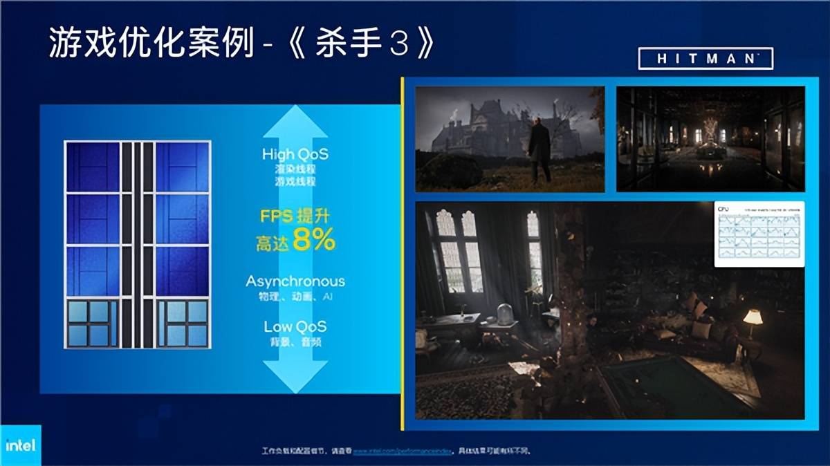 在游戏性能方面,英特尔继续在混合架构上工作。以《杀手3》为例,性能P core的强有力的单核性能负责高负载的图形渲染线程,高效的E内核以非同步的方式处理像AI、音乐、背景等相对低负载的线程。平均帧速率大大提高。