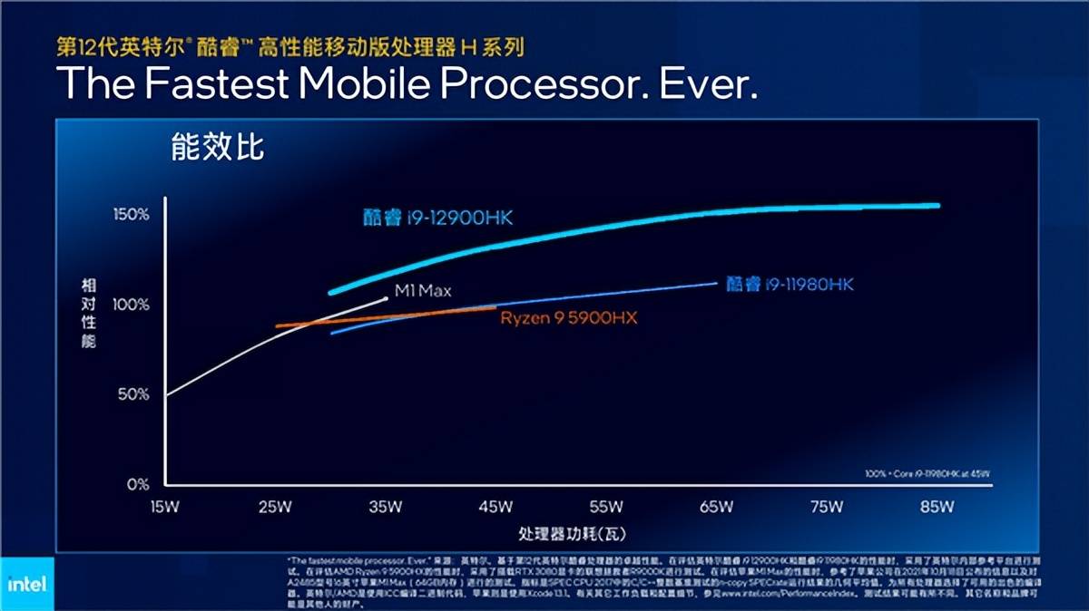同时,根据英特尔的官方数据图,i9-12900HK在功率控制/性能比上比旗舰处理器(如苹果M1 Max)表现更好,最大性能改进率超过40%。