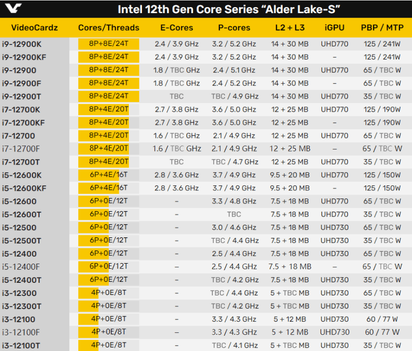 值得一提的是,虽然Intel在第12代CPU上首次采用混合异质模式,但从英特尔的官方参数图中,只有i5-12600K和高级i9和i7系列具有两个性能核心,其余的i5和i3系列只有P核心。