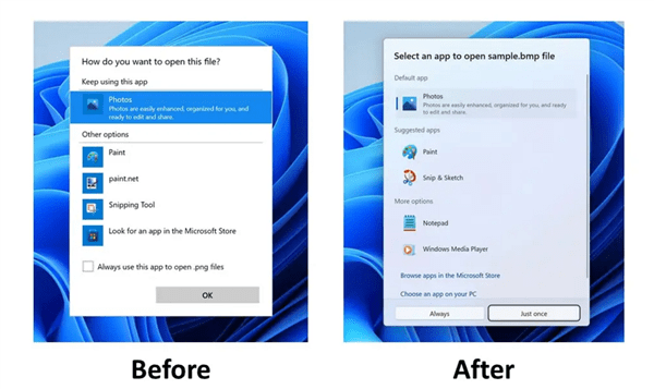 当用户右击任何文件并试图使用特定应用程序打开它时,显示“打开模式”对话框。“开放模式”对话框最后更新是在Windows 8时代(2012年10月26日发布)。它现在根据Windows 11设计风格重新设计。