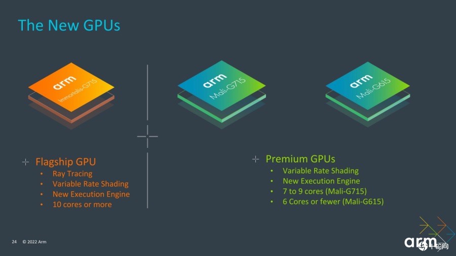 该新产品包括Immortalis-G715旗舰显示芯片和Mali-G715和Mali-G615高级显示芯片。