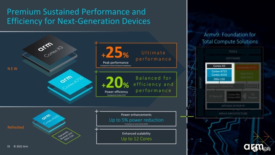新的Cortex-X3比其前身Cortex-A715提高性能25%,Cortex-A510降低了功率消耗5%,而DSU-110支持最多12个处理器核心。