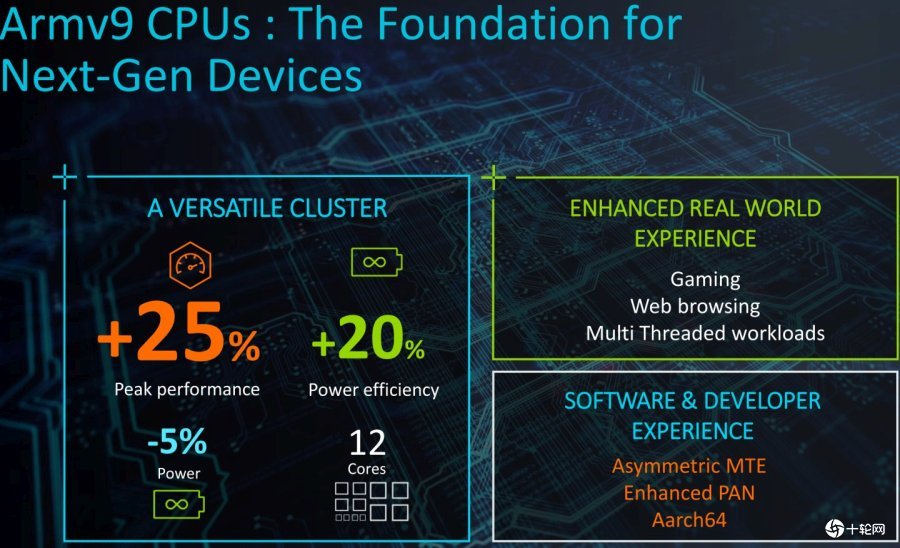 总的来说,新的ARMv9架构产品线可以提高峰值性能25%或功率效率20%。