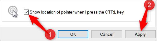在窗口底部,激活“在按Ctrl键时显示指针位置”选项框,然后单击“应用”。