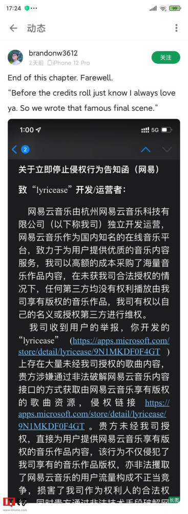 7月1日,IT House reported that a developer had recently received a notice from Netscape about the infringement, claiming that users had complained that Netscape demanded that developers immediately remove third-party Netscape cloud music UWP applications such as LyricEase from Microsoft's application stores and stop all infringements.