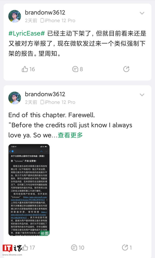 LyricEase开发商 brandonw3612表示,它已经采取主动撤销 LyricEase,但应该由另一方报告,微软也发布了类似的强制撤销报告。