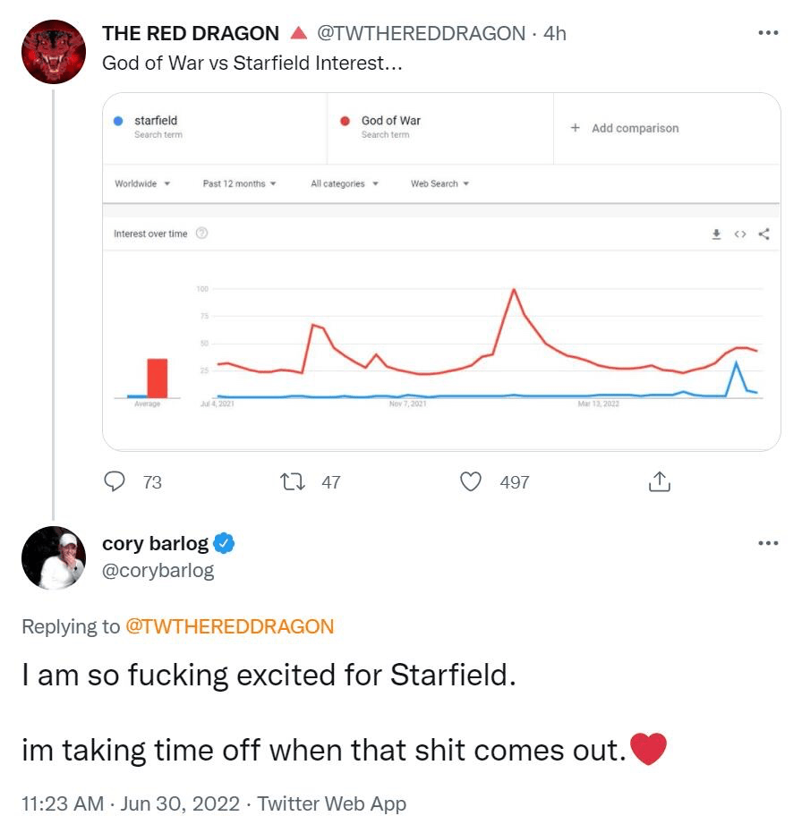 一位网民在Twitter上做了数据比较,他说,许多网民都期待着索尼的《战士》的新作品。而相比之下,人们对微软的新星际旅行的期望要低得多。对网民的评论,游戏的导演科里·巴洛格(Cory Barlog)对此作出了回应。他说他期待着星际空间。游戏发行后,他将被特别邀请在假期玩游戏。