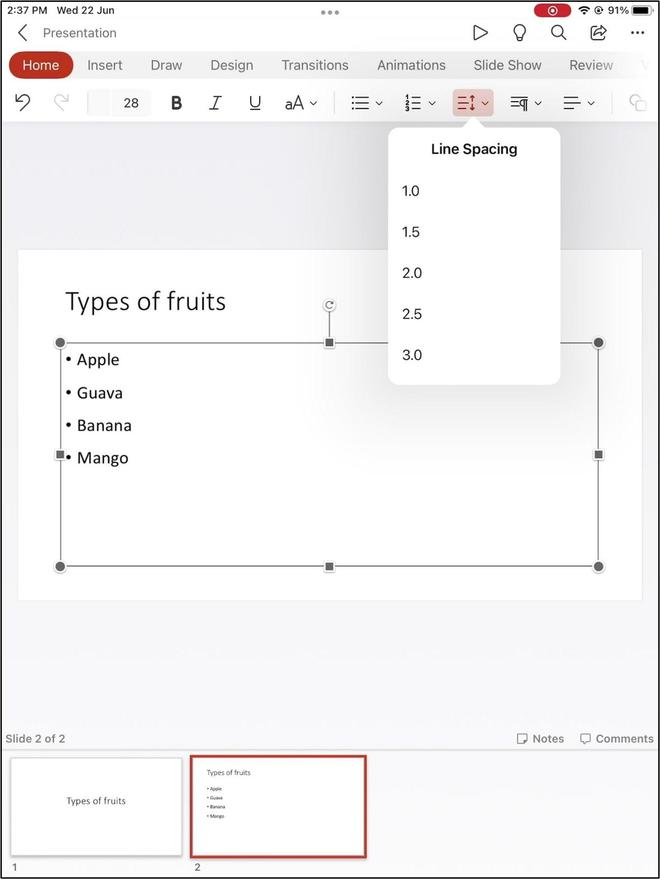 与PowerPoint桌面版本类似,行间距功能可以通过主界面上的Home标签上的特殊按钮实现。
