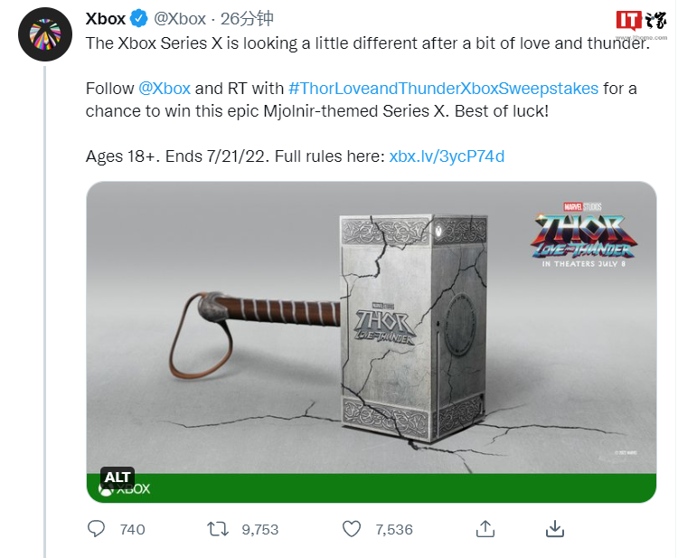7月1日微软Xbox官方宣布今晚将与电影《雷登4》一起发行一个共同品牌主机,使用雷登的锤子,看起来非常酷。
