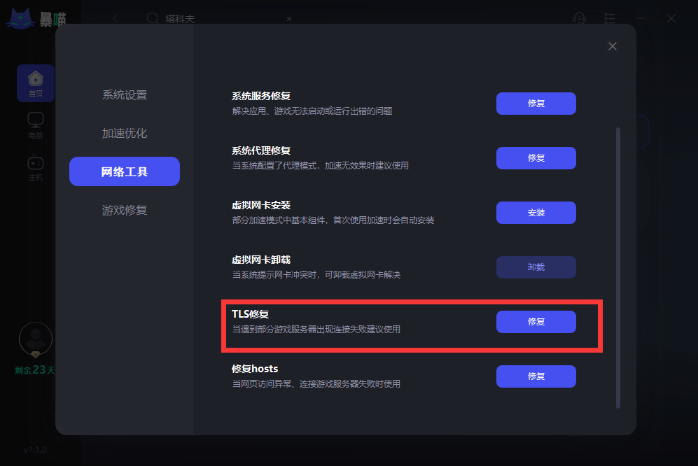 3,修改TLS,即修改互联网属性,baomiao通过点击安装的右上角加速客户端,在网络工具中找到TLS修复工具,点击修复并尝试进入微软接口。