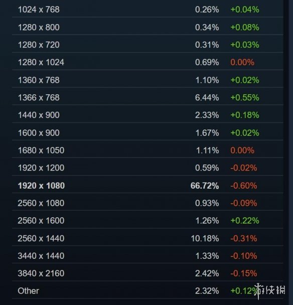 主显示屏分辨率通常为1920x1080,使用率为66.72%,其次为 2560x1440(所谓的2K),使用率为10.18%,只有2.42%的用户使用4K屏幕(3840x2160)。