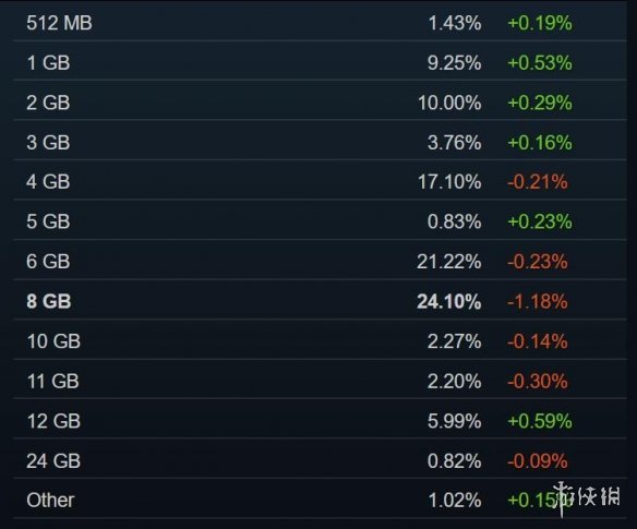 目前,有24.10%的玩家使用8GB的内存和21GB的视频,22%的玩家使用6GB的内存。