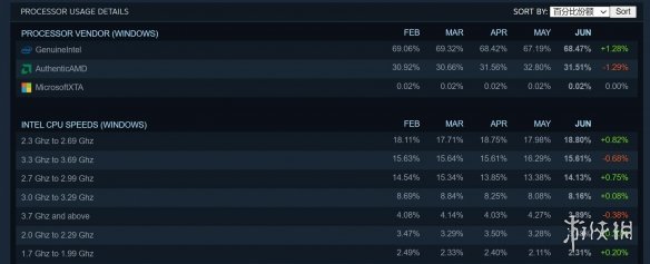 至于处理器,Intel用户占64.47%,从5月1.28%上升,ADM占31.51%。Intel CPU的最高利用率为2.3 Ghz~2.69 Ghz处理器。