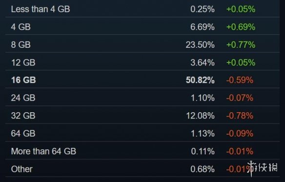 在内存方面,一半的玩家使用16GB的内存,但有4G和8G内存的玩家数量已大幅增加。