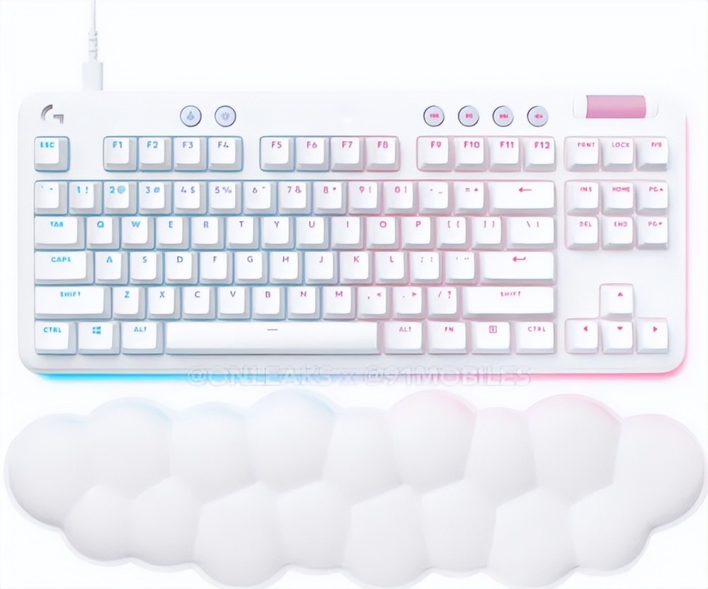 Rogue Aurora G713 TKL 在左上角有一个亮度和游戏模式开/键,紧挨着一个恶意标记。 键盘支持RGB背灯,壳是白色,底部有一个RGB光带。