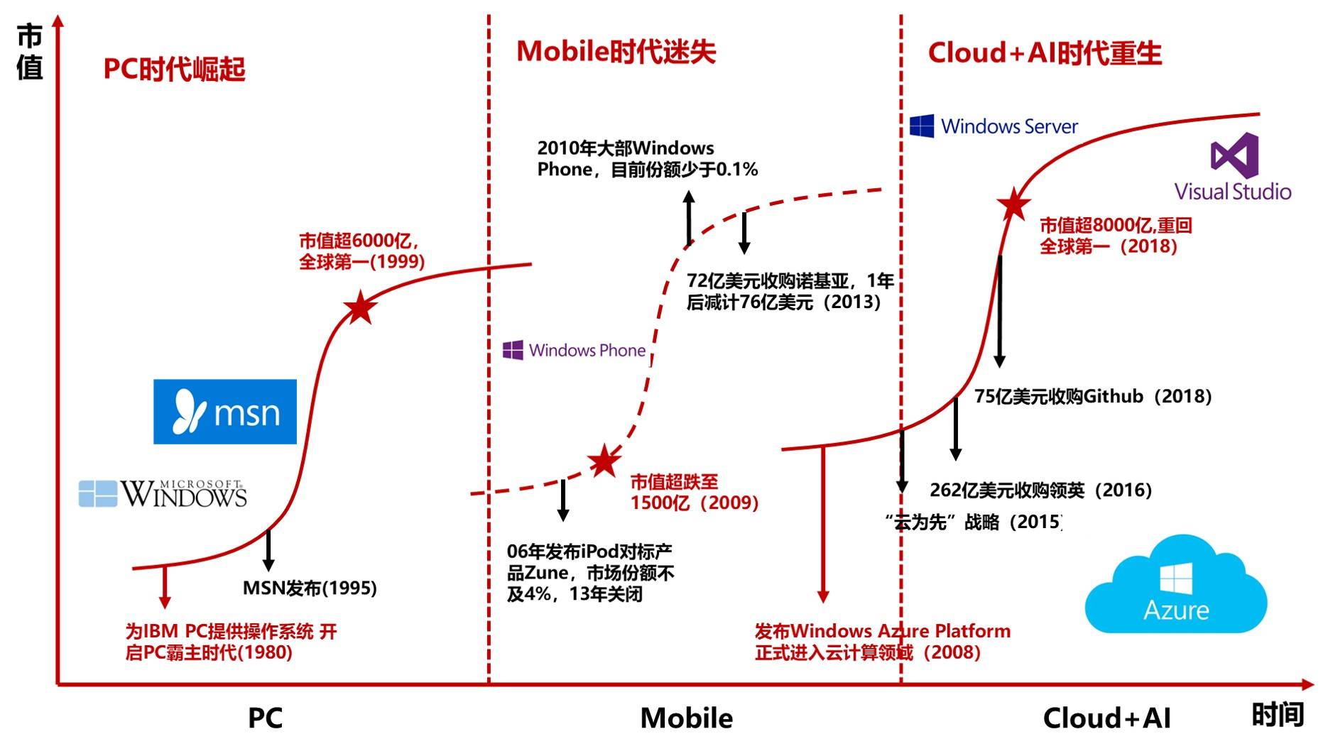 在PC时代,微软在Windows系统和Office软件上占主导地位,并在199年成为世界上最大的增值企业,拥有令人印象深刻的60万亿美元,并在第一个曲线中取得了最大的成功。