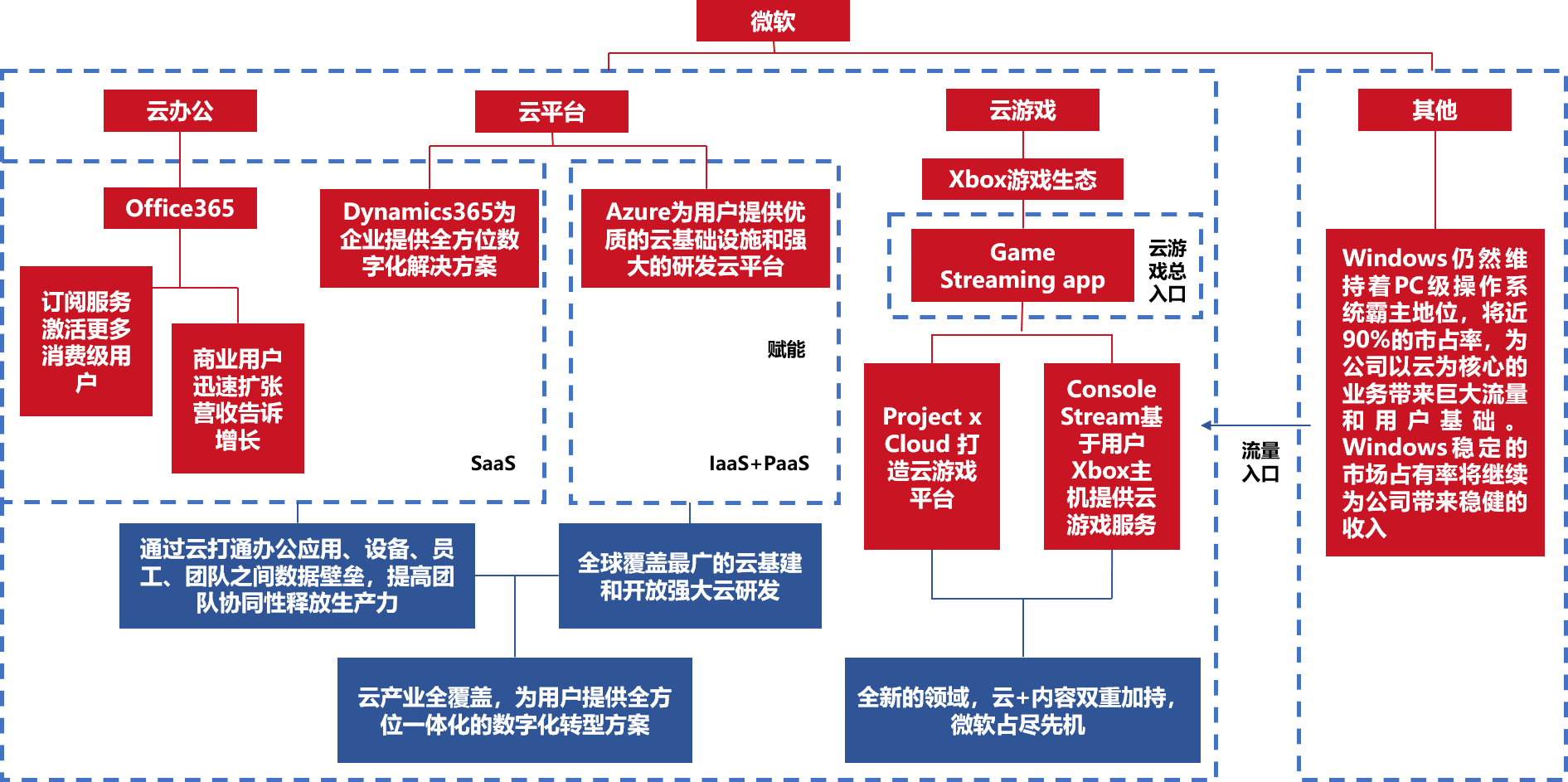 从纳德拉的移动优先、云优先战略,微软进入云+人工智能时代,以Azure为核心。2016年,公司重组了业务结构,目前,公司分为三个类别:智能云业务、生产率和业务流程以及更个性化的计算。微软已经放弃了过去的失败战略布局,战略重点是基于Azure云平台的生态建设,从微软的商业生态系统来看,这并不难看,微软通过Azure Cloud已经突破了办公室应用程序、设备、员工和团队之间的数据障碍。世界上最大的云基础设施已经建立,并相应扩展到云游戏领域业务,该平台模型为生态系统参与者提供全面综合的数字转型方案。而过去的生态基础(稳定的企业层次市场)已经成为它所创造的新生态系统的流入。自这一转变以来,微软的市场价值一直在稳步上升,2019年,苹果以超过8亿美元的回报回到了世界第一。如今,微软的市场价值超过了20亿美元。云时代,微软已从软件许可费业务模式转变为SaaS(Office 365、Dynamic 365等)服务的订阅系统和Azure云服务的“随身支付”模式。随即增加的SaaS客户数目和Azure规模的影响,微软在智能时代取得了彻底的复兴.