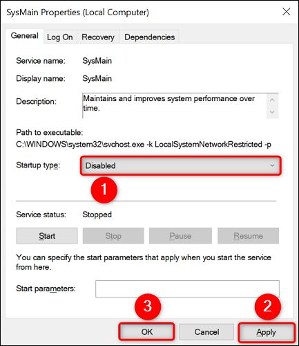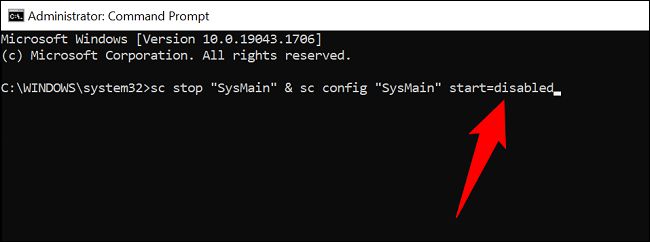 sc stop "SysMain" & sc config "SysMain" start=disabled